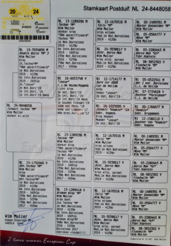 The background makes his gesture even more meaningful. Aad had received this bloodline from the 1st National Barcelona 2019 pigeons from two fanciers he had helped in the past with young birds. They did not want their colony to be dispersed through a sale and entrusted Aad with their entire team: racers and breeders alike. Together with another well-known pigeon friend, the pigeons were carefully selected. Some racers were settled in with a third fancier, and four of the Wim Muller pigeons were lent to DuijvesteinHattem.